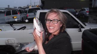 Chernoff is entirely self-taught and has been experimenting with processing and sewing gut materials for the last few years. She says she enjoys making items that use natural materials from her home on Kodiak Island; along with working with intestines, she also experiments with bird skins, grasses, spruce roots, fish skins, and furs. With the bear gut that she brought to the museum, she plans to make her son a parka. The process is labor intensive and requires intimate knowledge of the properties of the gut material: after the animal is killed, the intestines are removed and thoroughly washed. Both the inside and outside are scraped clean with a spoon to remove all of the fatty tissues. Once clean, the intestines are hung to dry. They can then be split down the middle, wrapped into a ball, and stored in a cool place until she is ready to use them.